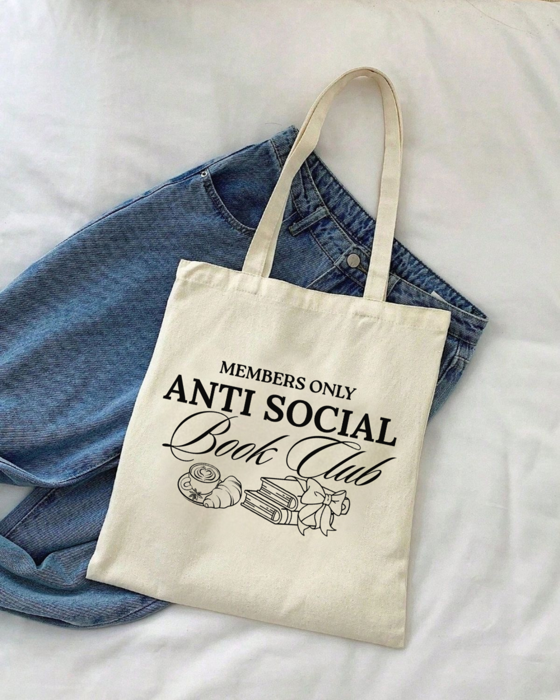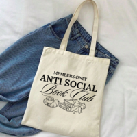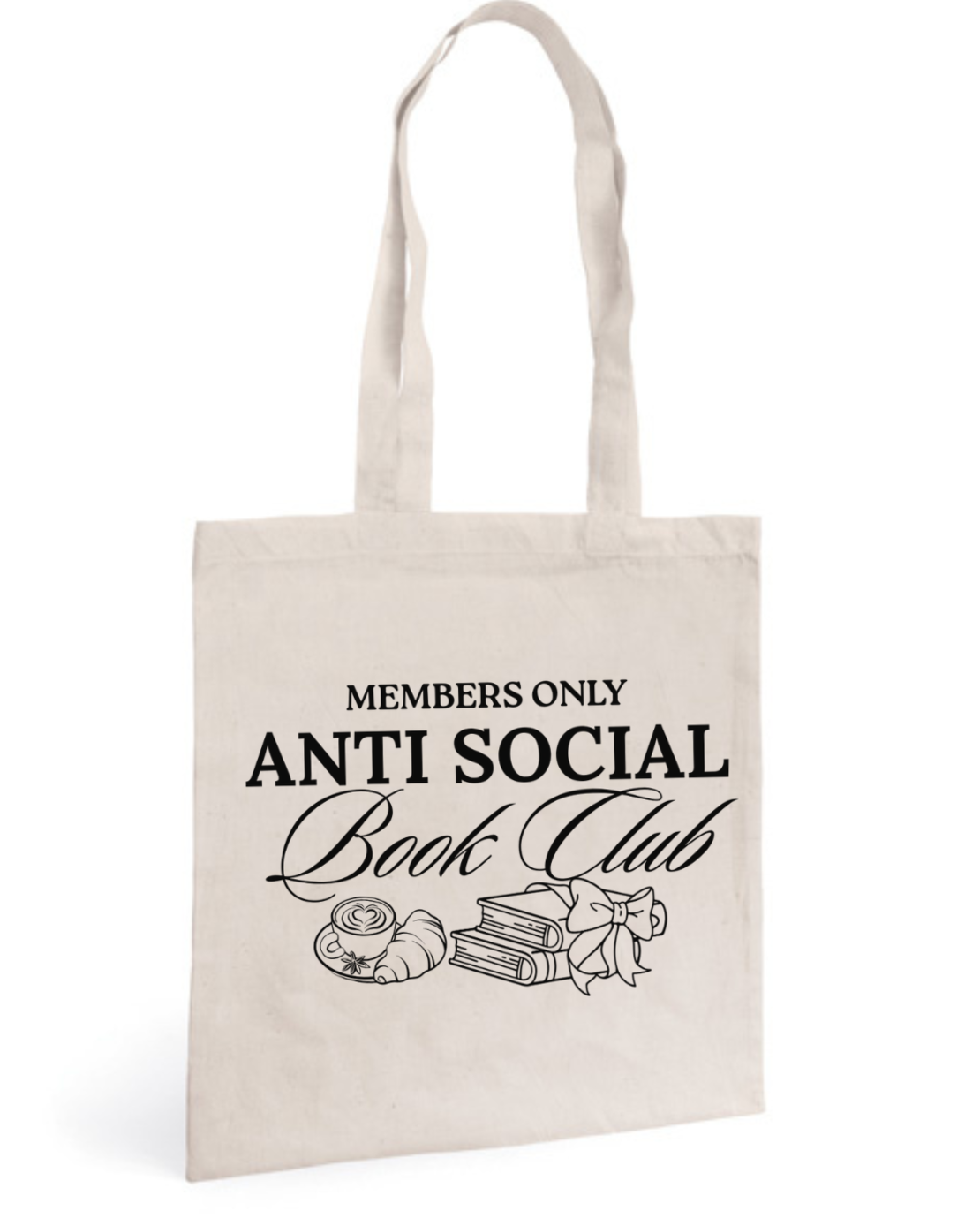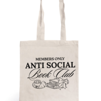 Текстилна чанта „Anti Social Bookclub“ от 100% памук — дизайн, който говори директно за любовта към книгите и всички моменти, когато предпочиташ тишината пред шума. Натуралният цвят и устойчивият материал я правят подходяща както за библиотека, кафе, така и за ежедневие. Подсилени дръжки за носене през рамо.